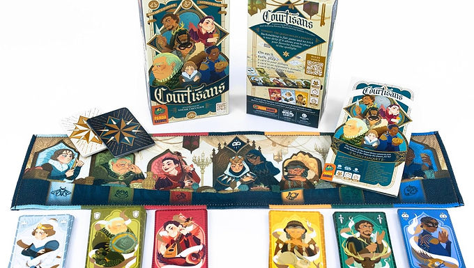 In Courtisans, you receive and play three cards on each of your turns. One is played at the Queen's table to sway a family's influence, whether in a positive or negative manner. The two other cards are played in your domain and in an opponent's domain, and they can be worth positive or negative points, depending on their family's status at the end of the game. Choose where best to place your three cards if you want to end up with the most points and win.
